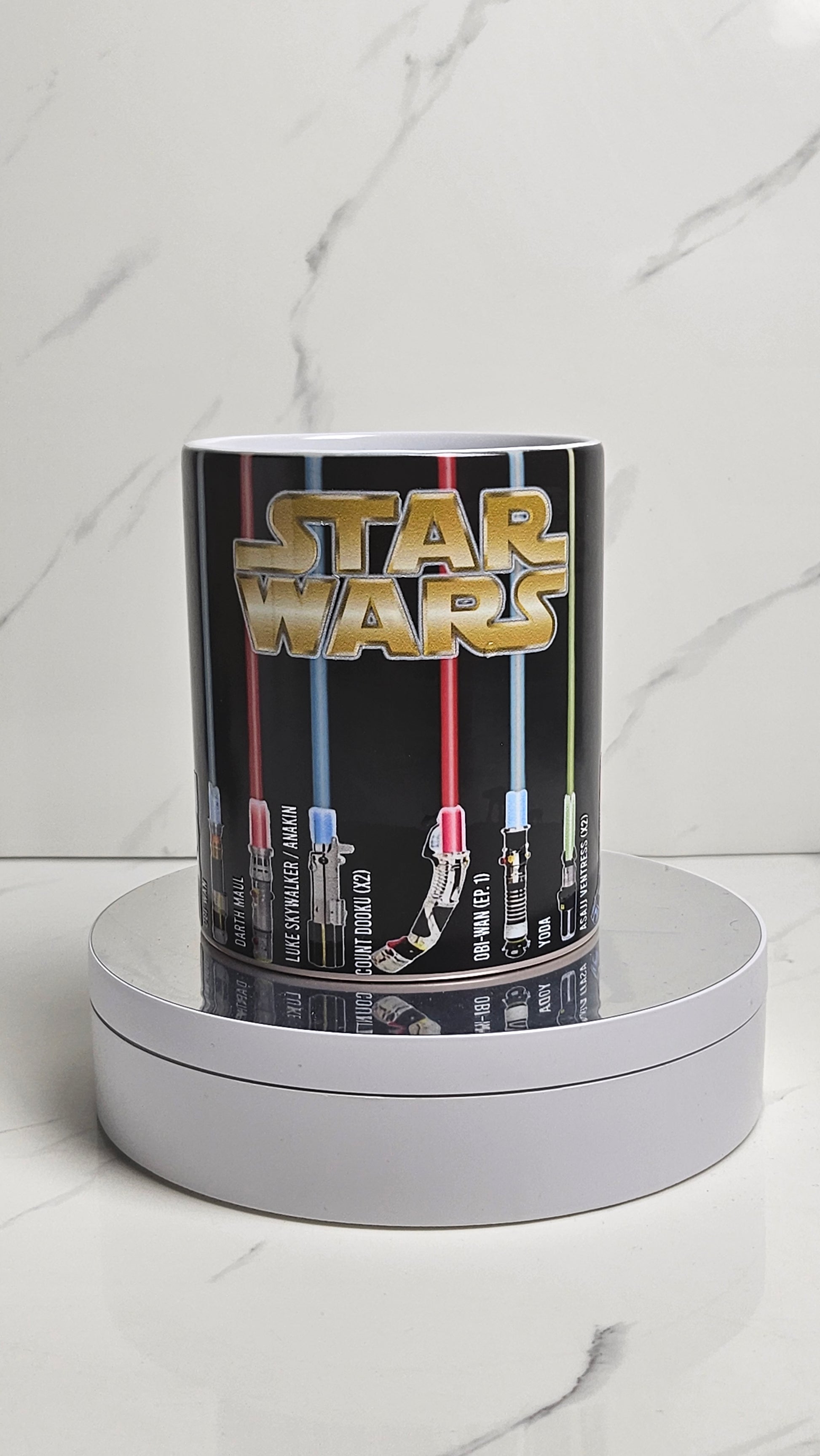 Por otro lado el diseño con efecto, la taza a primera vista se ven el cañón de cada laser,con los nombre y el logo STAR WARS, y cuando se le agrega el agua caliente, empieza a descubrirse el láser de cada espada)